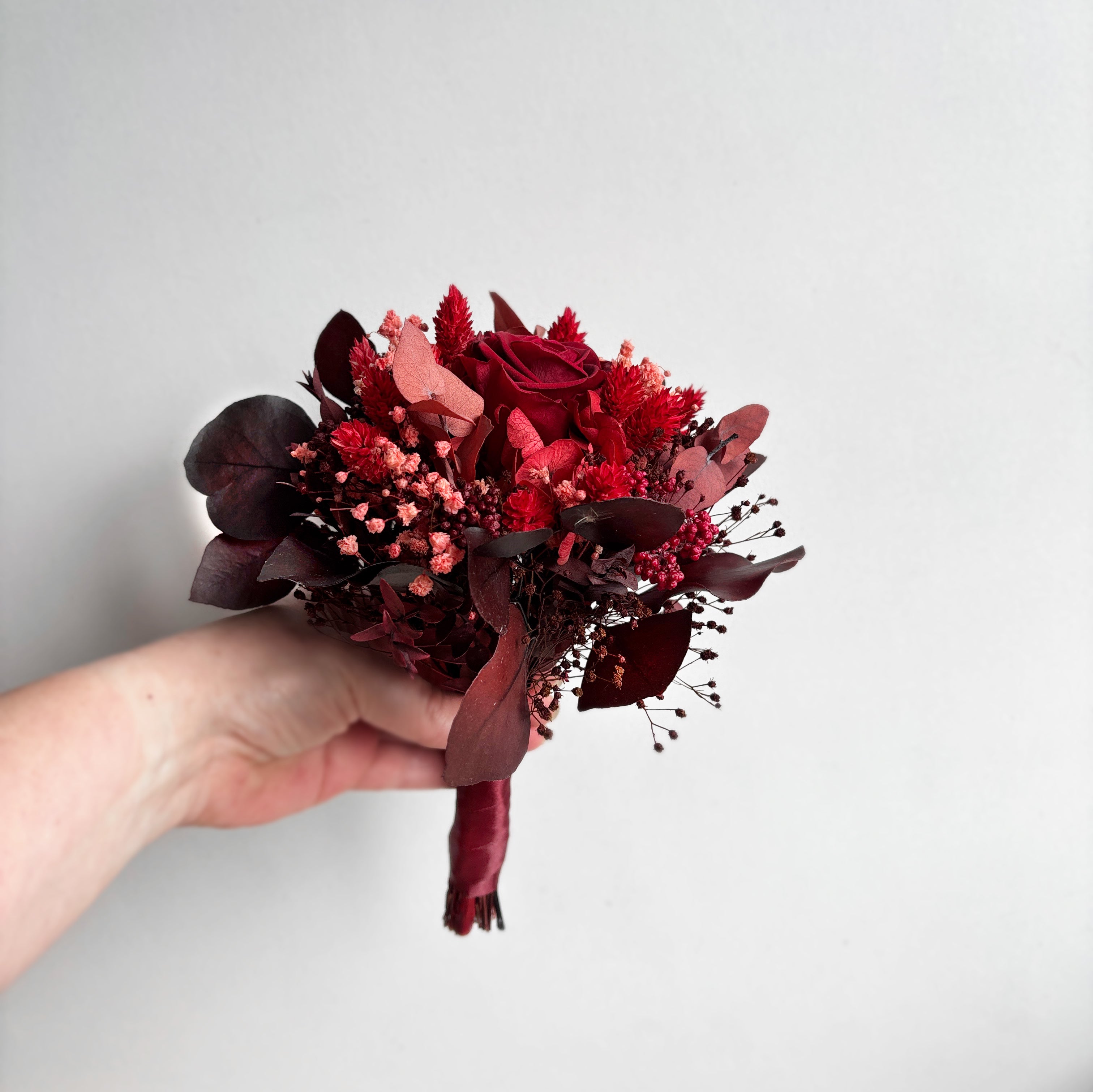 Dieser wunderschöne Brautstrauß besteht aus Rosen in Rot und Burgunderrot, Hortensie, Phalaris, Schleierkraut, Reisblumen, Broom und Eukalyptus.