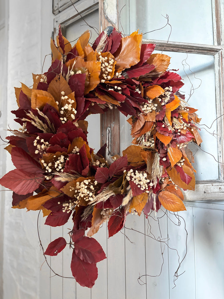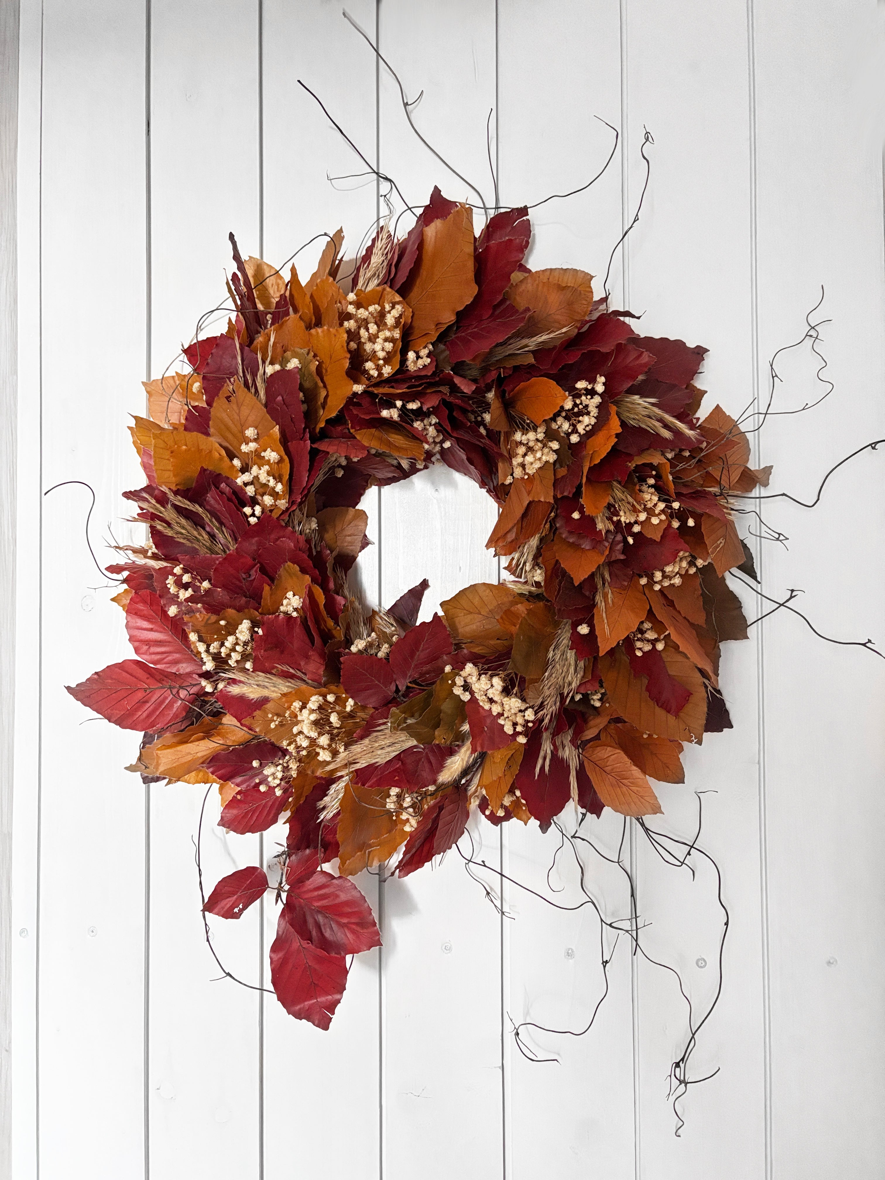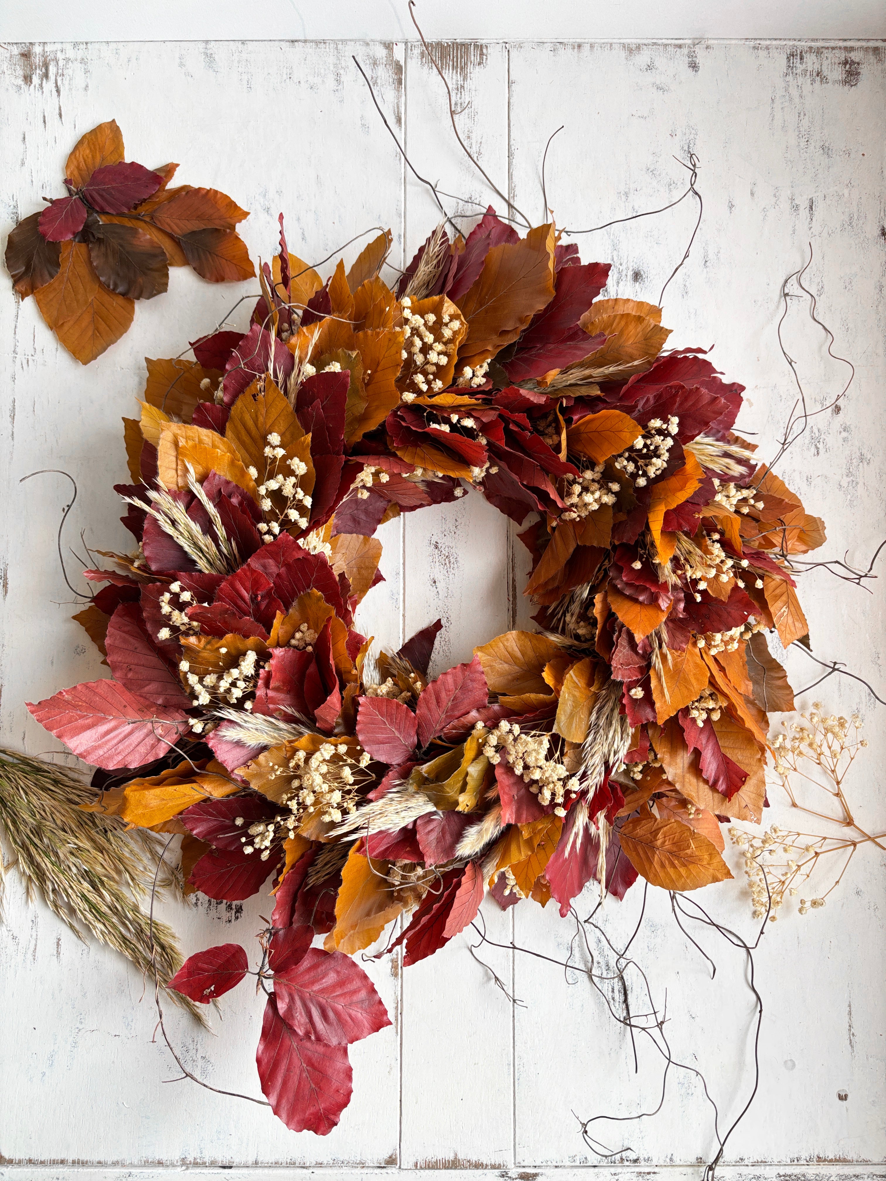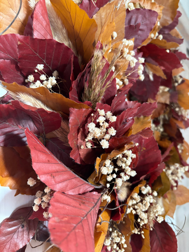 Dieser Trockenblumenkranz besteht aus getrockneten und stabilisierten Blumen wie Buchenblätter, Schleierktaut, Pampas und auf Strohrömer gebunden.