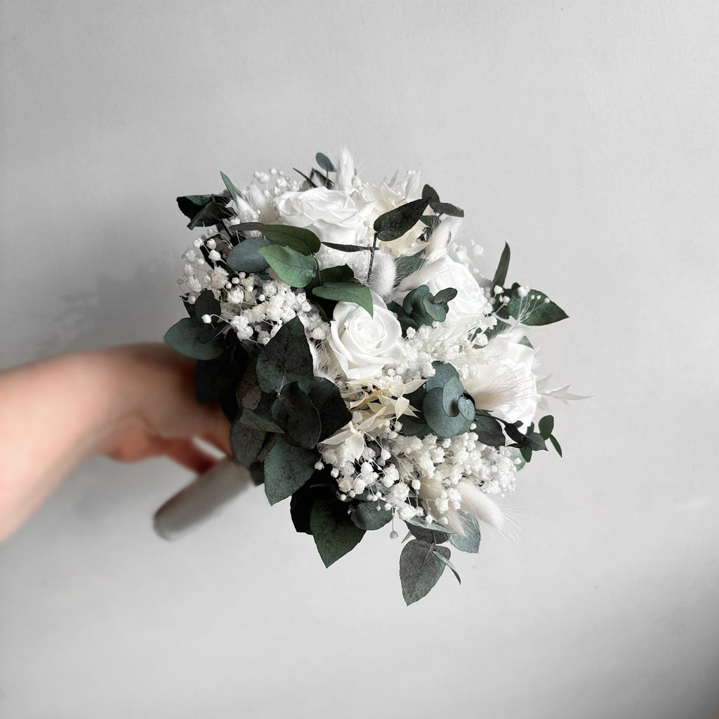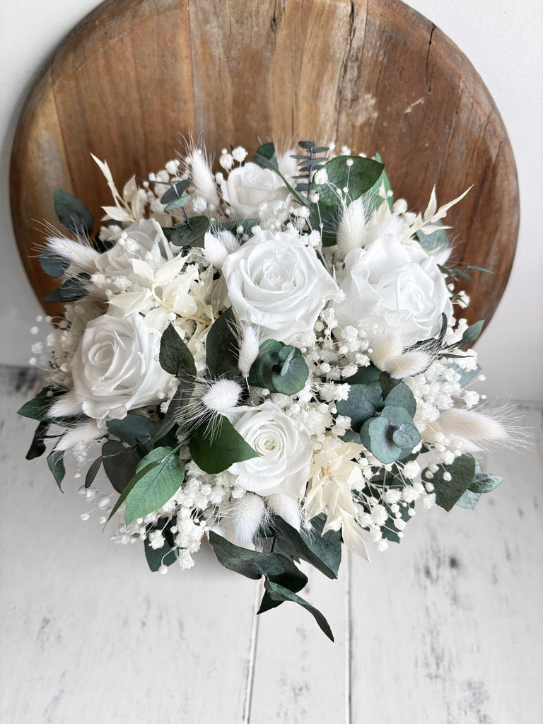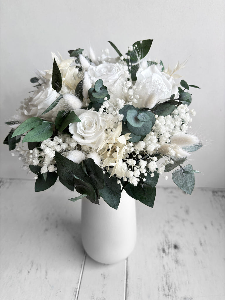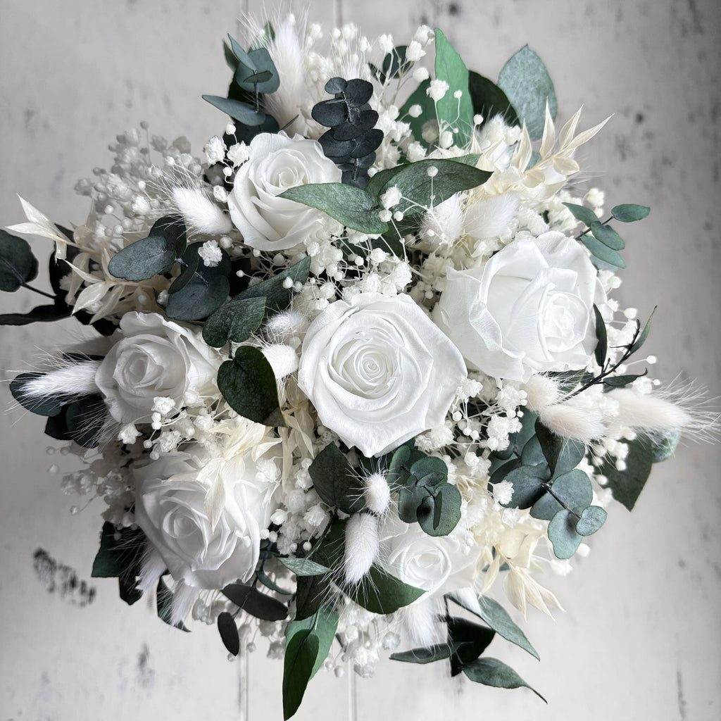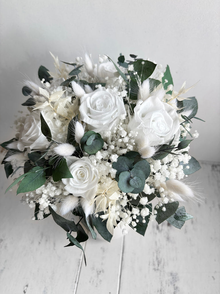 Dieser schöne Brautstrauß besteht aus 6 Rosen, Hortensie, Lagurus, Ruscus, Schleierkraut und Eukalyptus.