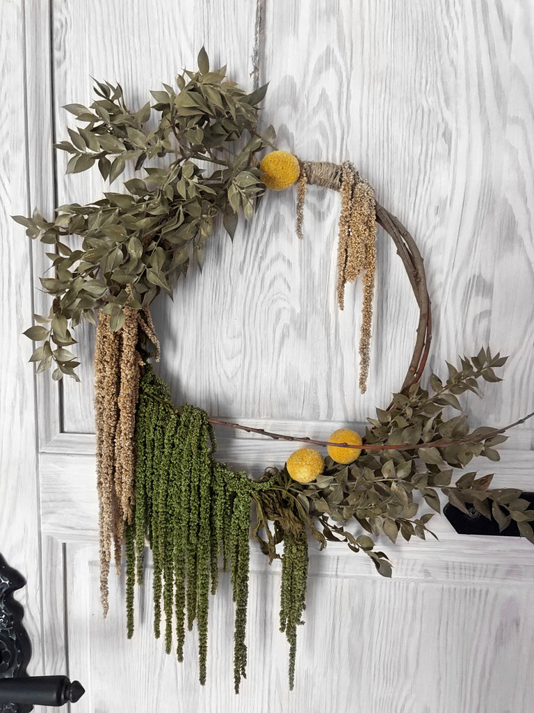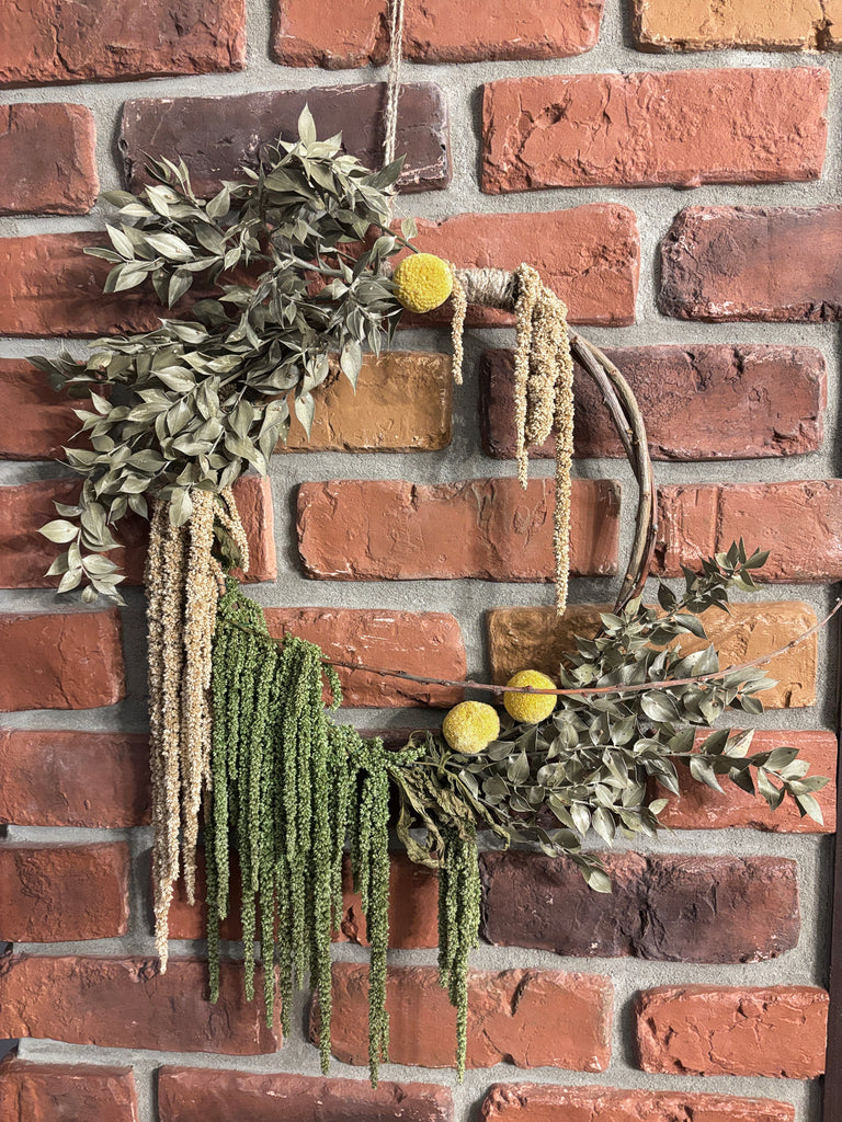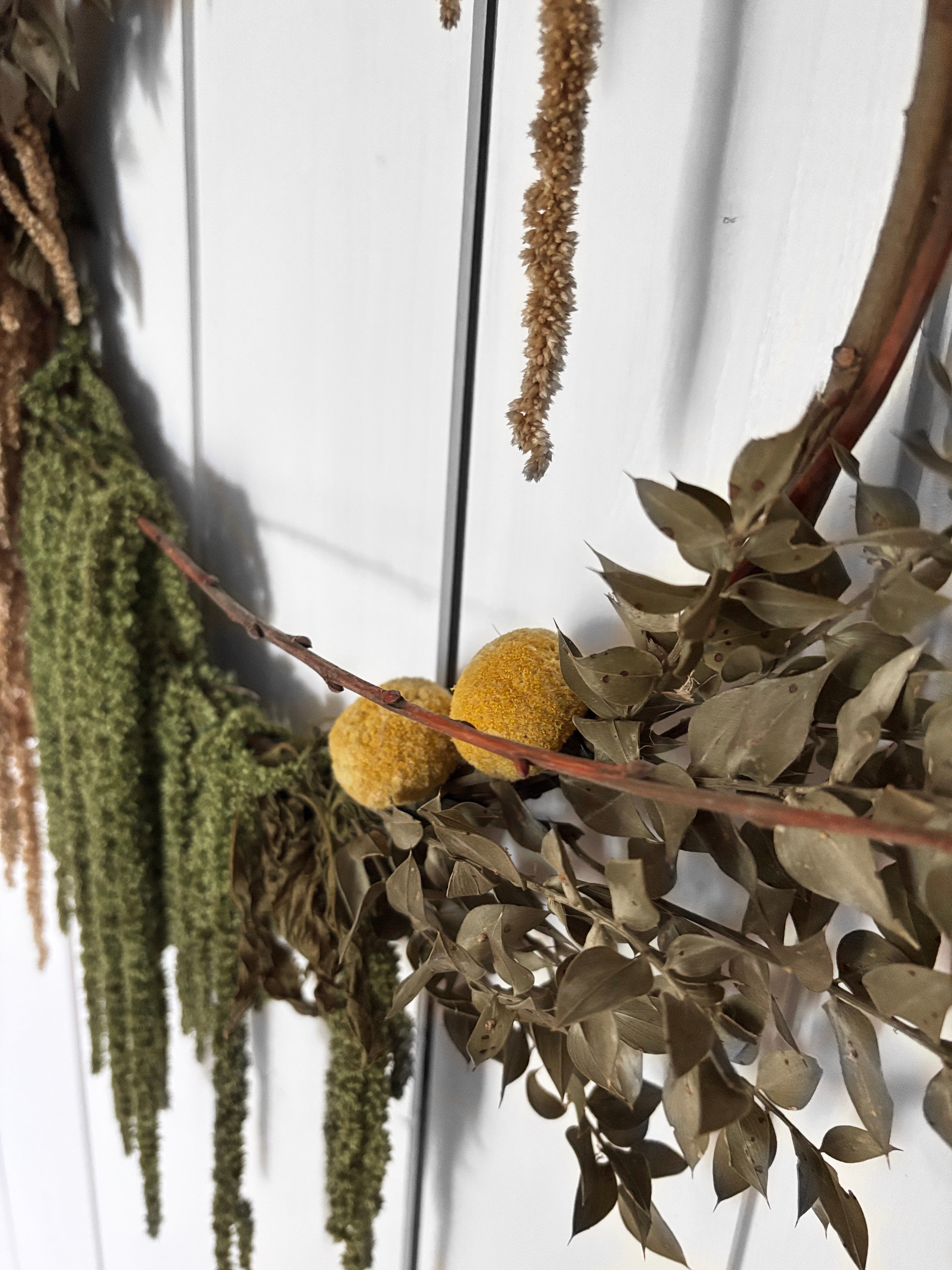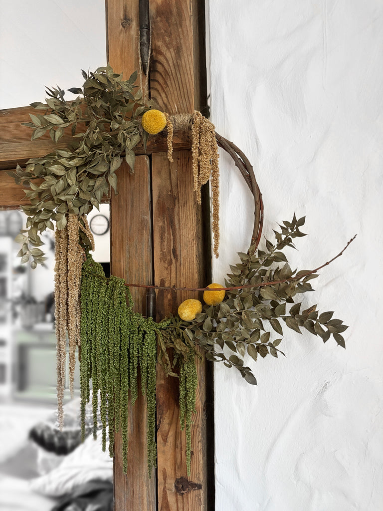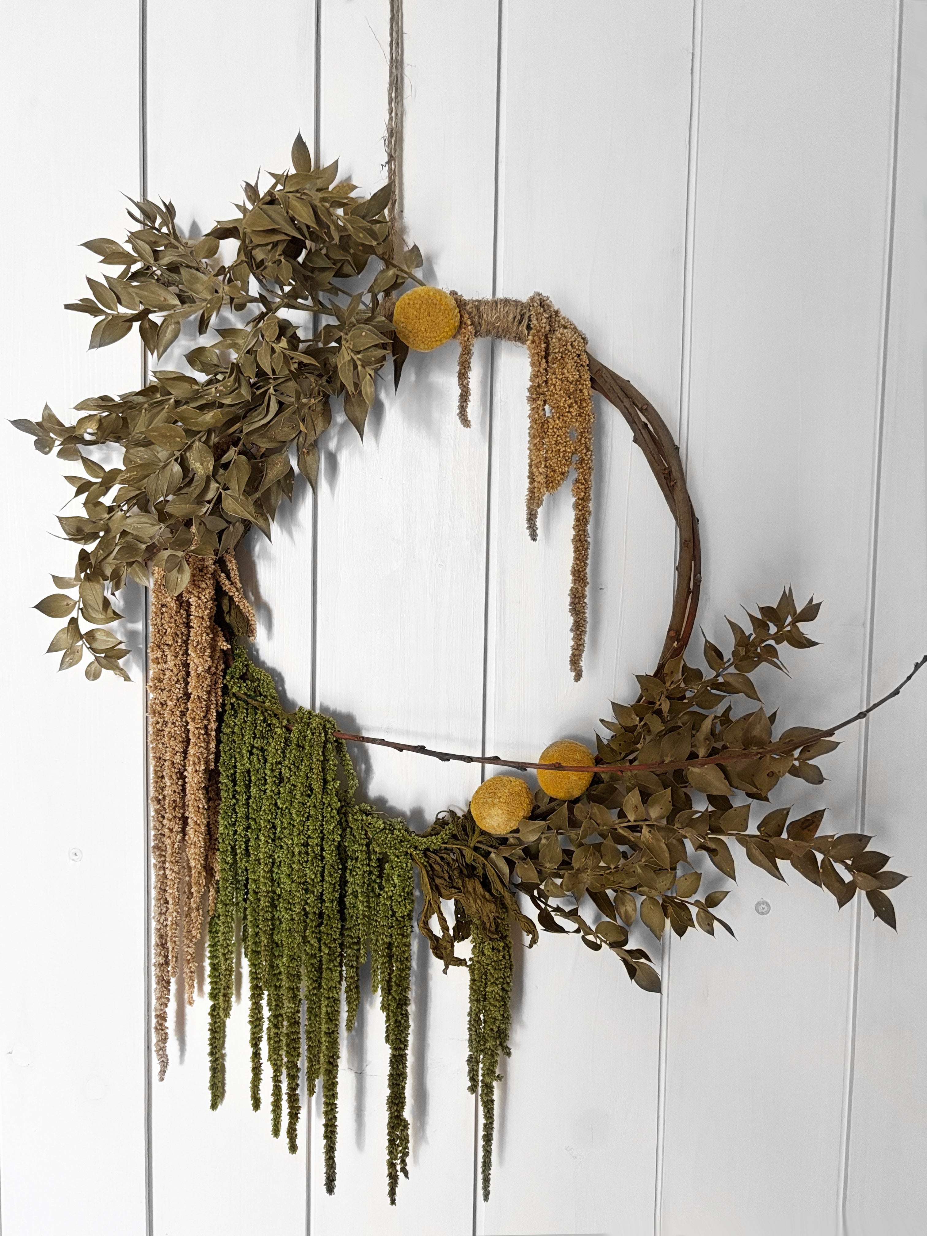 Dieser Trockenblumenkranz besteht aus getrockneten und stabilisierten Blumen wie Ruscus, Craspedia, Amarant und auf Zweigenkranz gebunden.